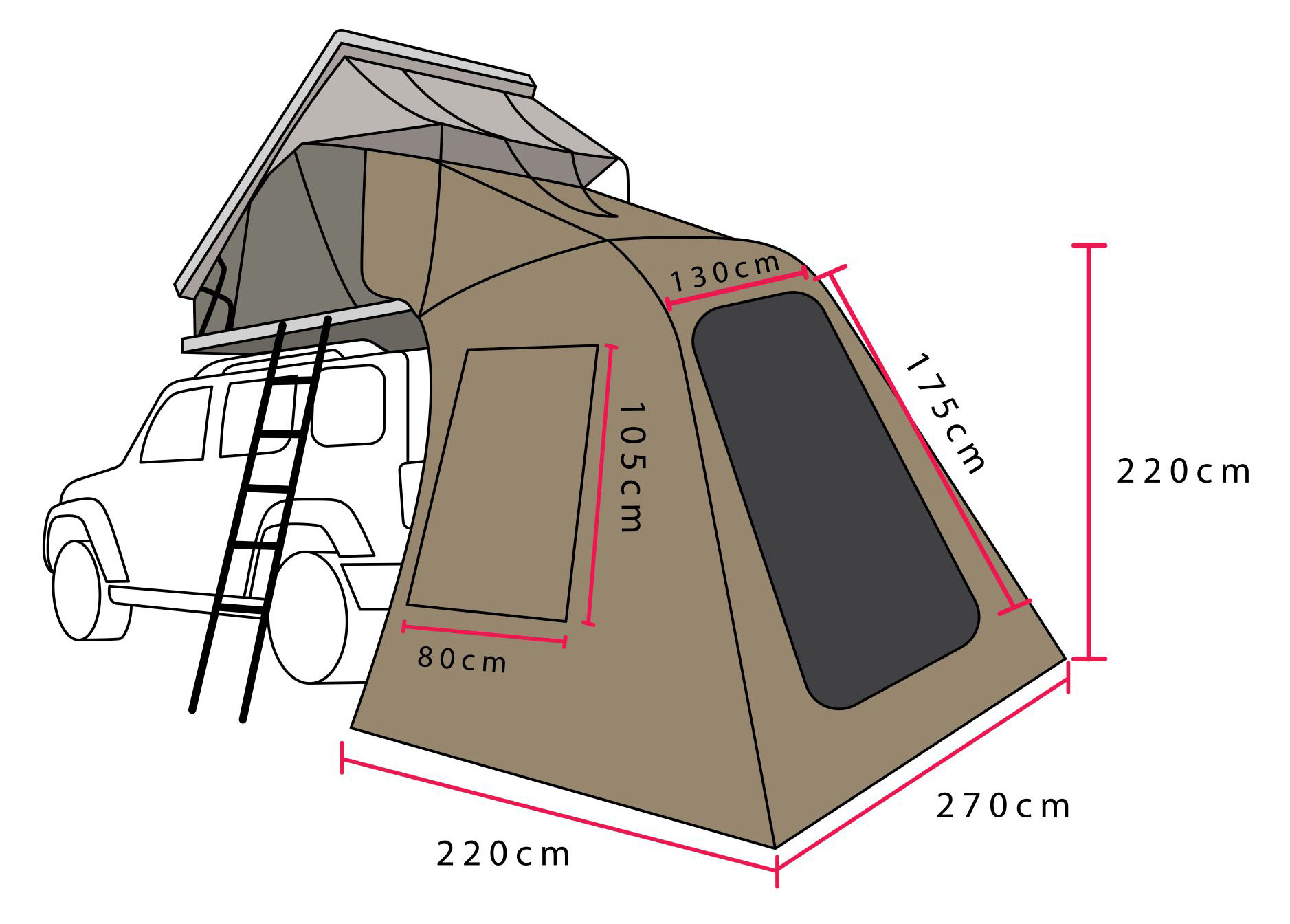 - Dépliée : Largeur : 220 cm, Profondeur : 270 cm, Hauteur maximum : 220 cm, Hauteur minimum : 180 cm