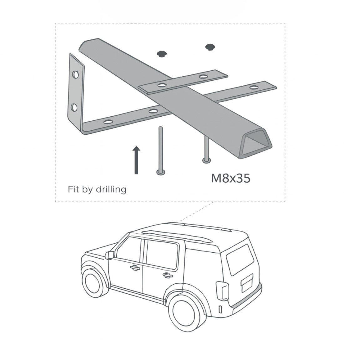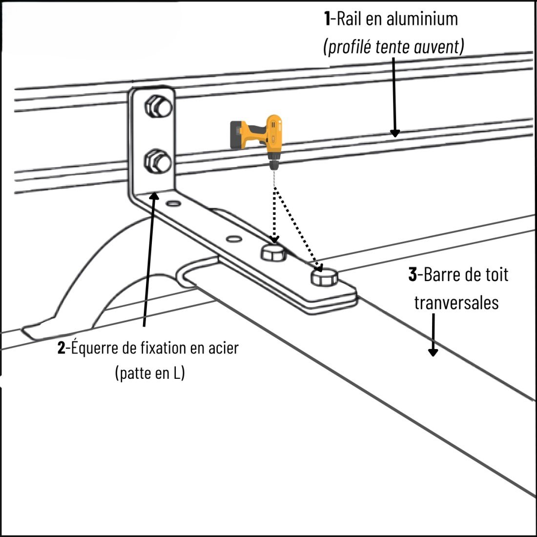 Livré avec un kit de montage universel comprenant 2 supports en L, compatible avec la majorité des barres de toit du marché