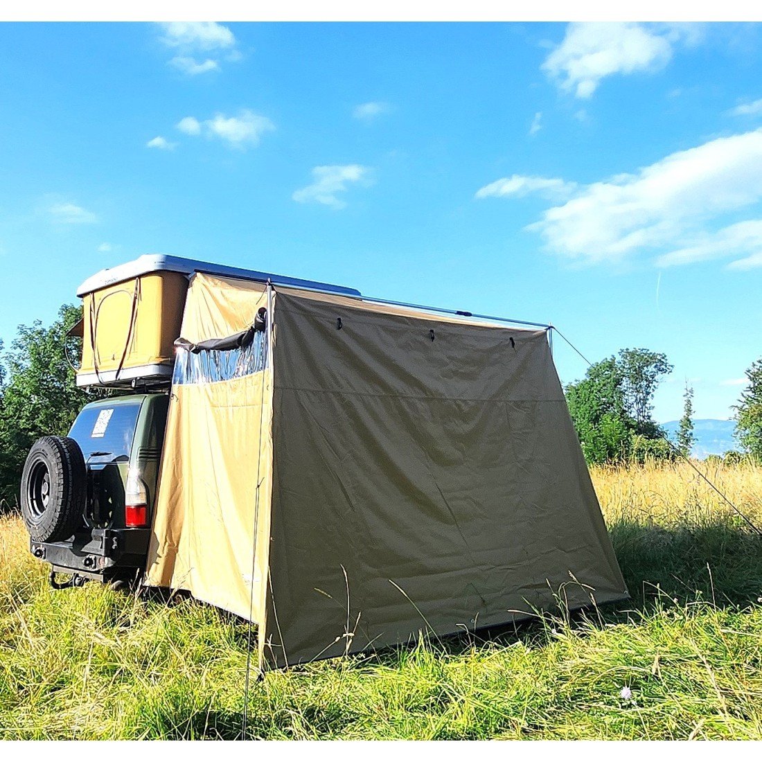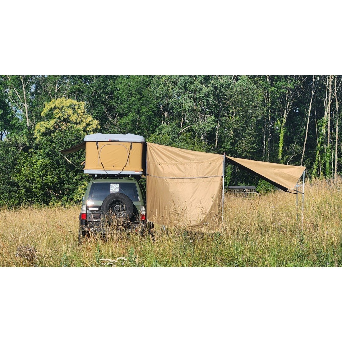 La hauteur du auvent est variable en fonction de la hauteur de votre véhicule. Hauteur maximum hors tout depuis le rail de la tente de toit Tundra jusqu’au sol 2.70m environ.