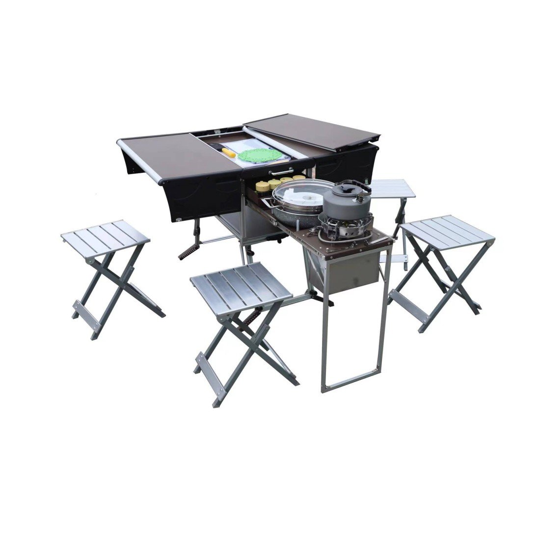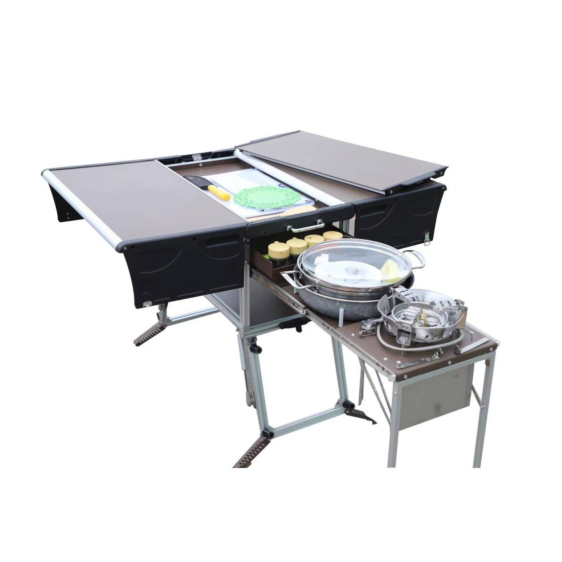 Elle comprend tout ce dont vous avez besoin pour préparer, cuisiner et déguster d’excellents repas en camping grâce à son réchaud (homologué CE), des chaises et des ustensiles de cuisine. Elle a simplement besoin d’une alimentation en cartouche de gaz norme EN417 avec une valve filetée.