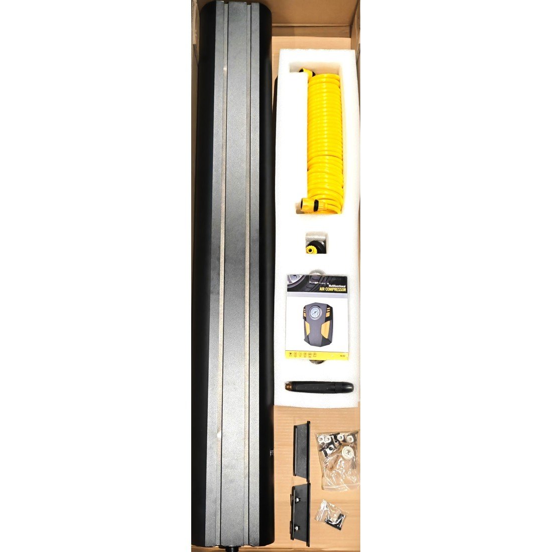 Compresseur : dc 12 volt pour prise allume cigare, longueur de câble 3 m , 100W, 10 A, maximum pression d’air 150 PSI, débit 30L/min, longueur du tuyau d’air 50 cm.